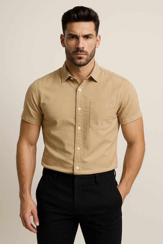 پیراهن کنفی نخودی مردانه تک جیب | پیراهن سبک و خنک تابستانی